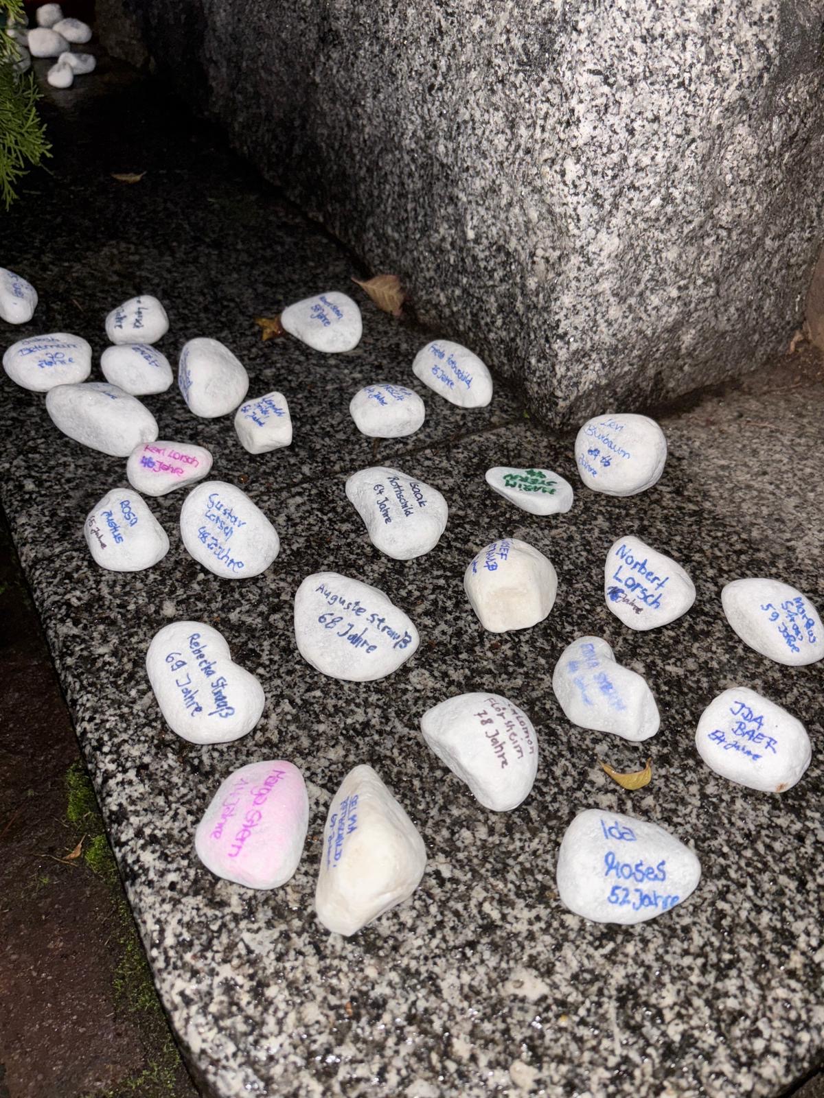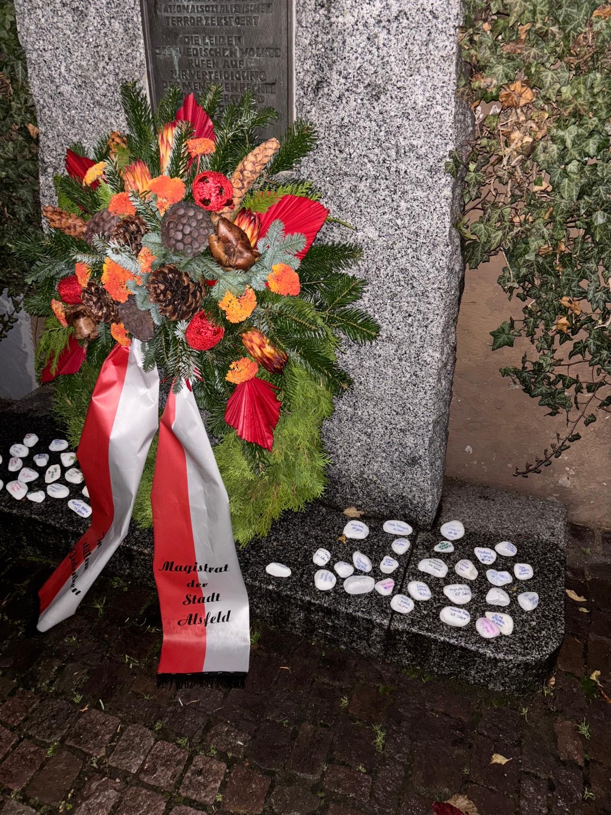 Zum Abschluss wurden die Namen der Menschen aus Alsfeld verlesen, die in der Zeit des Nationalsozialismus und infolge des Zweiten Weltkrieges ihr Leben verloren. Die Schülerinnen machten dies sichtbar, indem sie symbolische Stolpersteine mit den Namen der Opfer verteilten. Damit wurde ein Zeichen des Erinnerns und gegen das Vergessen gesetzt.